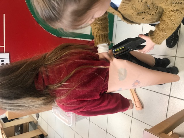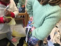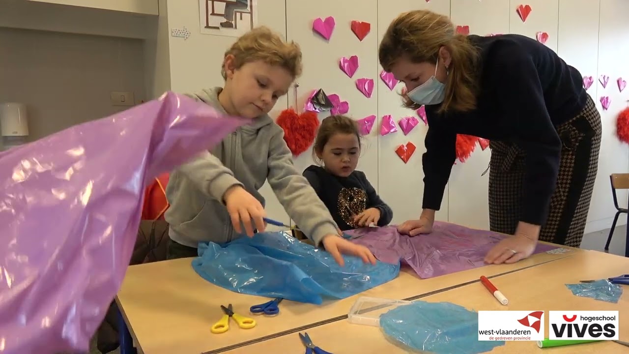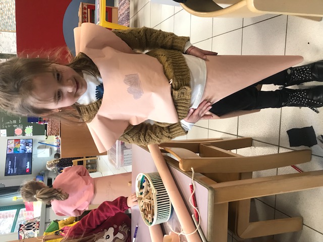 Vervolgens zetten we de stap naar het ‘doen’. Vooreerst dienen ze vanuit de vuilniszak te komen tot een ‘kleed’ die ze kunnen aandoen. We laten de kleuters aangeven hoe dit kan. We kunnen hen hierbij helpen door de vuilniszak te nemen en deze over hen of voor hen te houden. Zo ervaren ze dat hun hoofd en armen erdoor heen moeten. Zo positioneren ze hun hoofd en armen op de vuilniszak en moeten ze vervolgens openingen maken op de juiste plaats. Ook de grootte van de openingen moet kloppen. Krijgen ze hun hoofd er bv. niet door? Hoe komt dit? De opening is te klein.